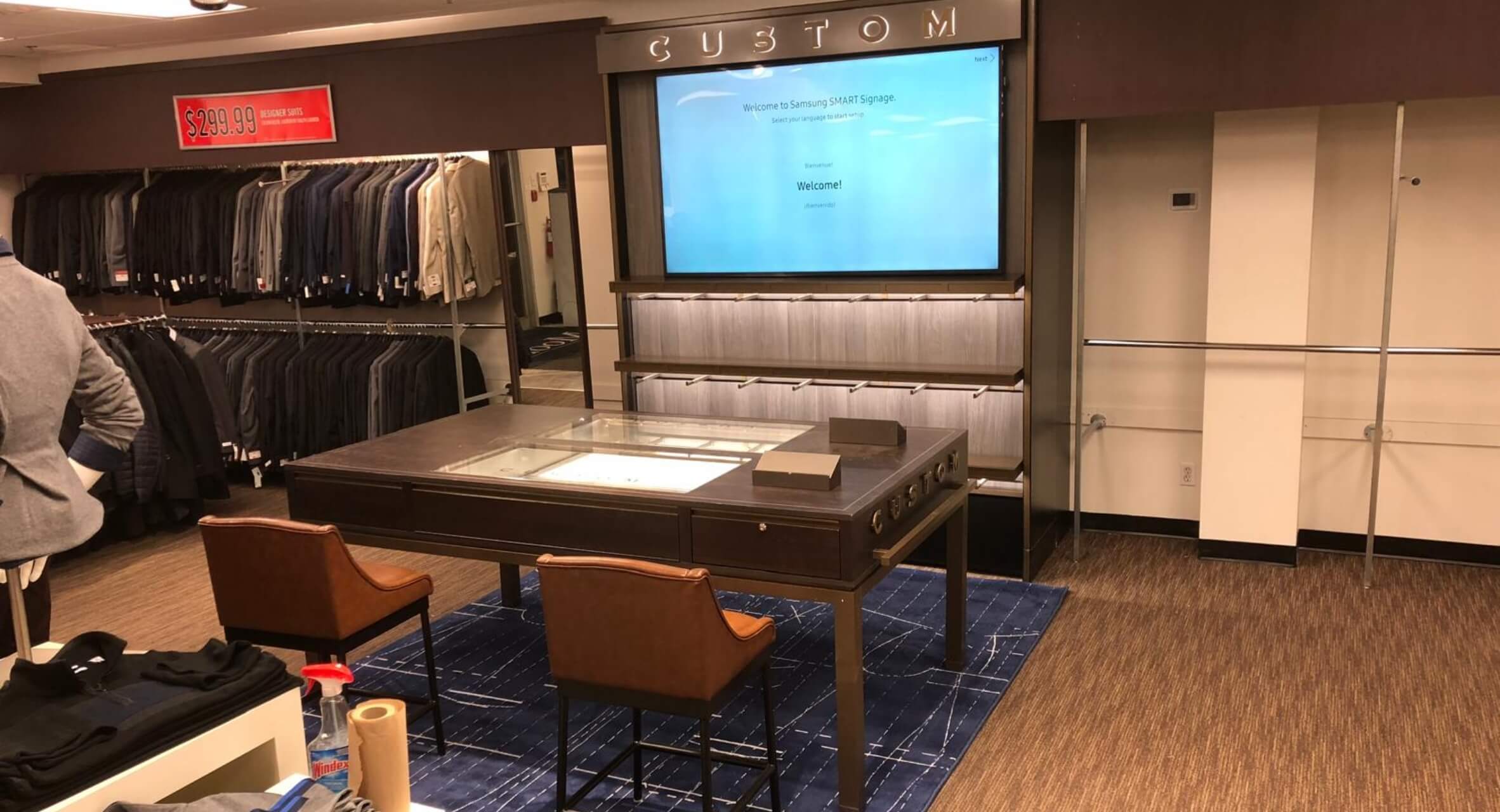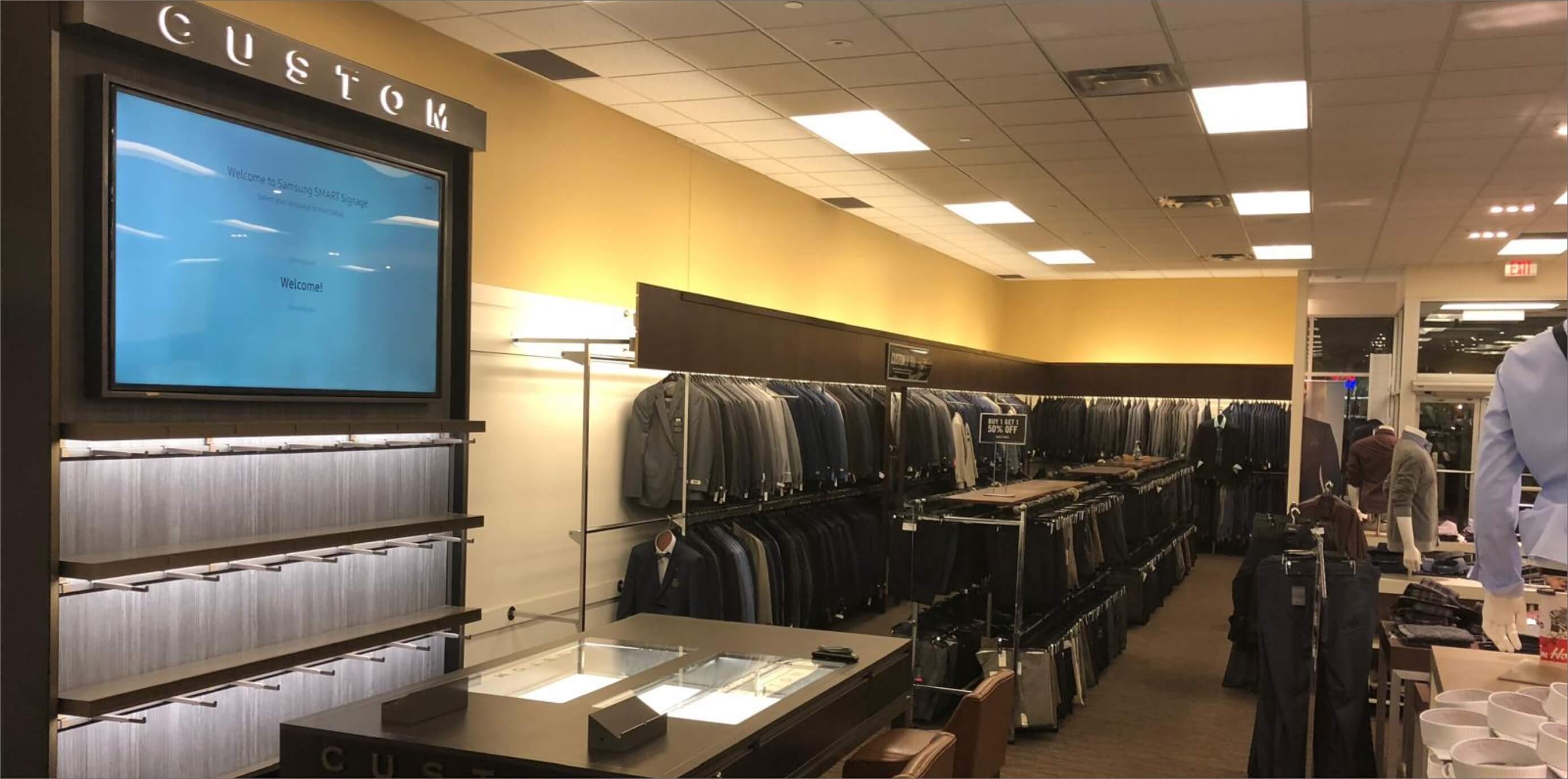 The finished design combines dark wood millwork, integrated lighting, digital signage, and clean display walls to create a tailored retail environment that reflects the brand’s focus on custom menswear. A central consultation table anchors the space, while the surrounding suit displays make it easier for customers to browse fabrics, styles, and ready-to-wear options in a setting that feels both professional and inviting.