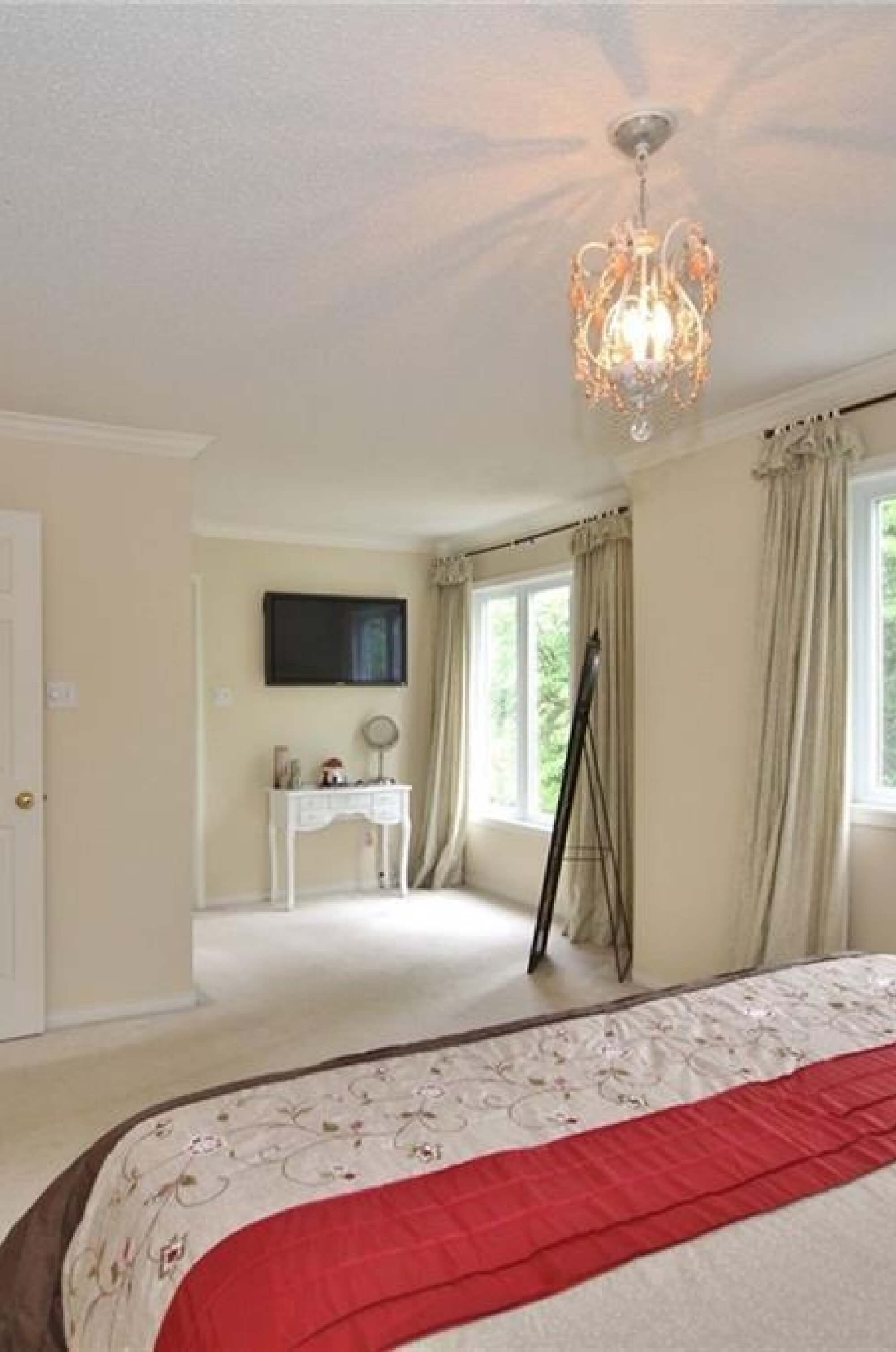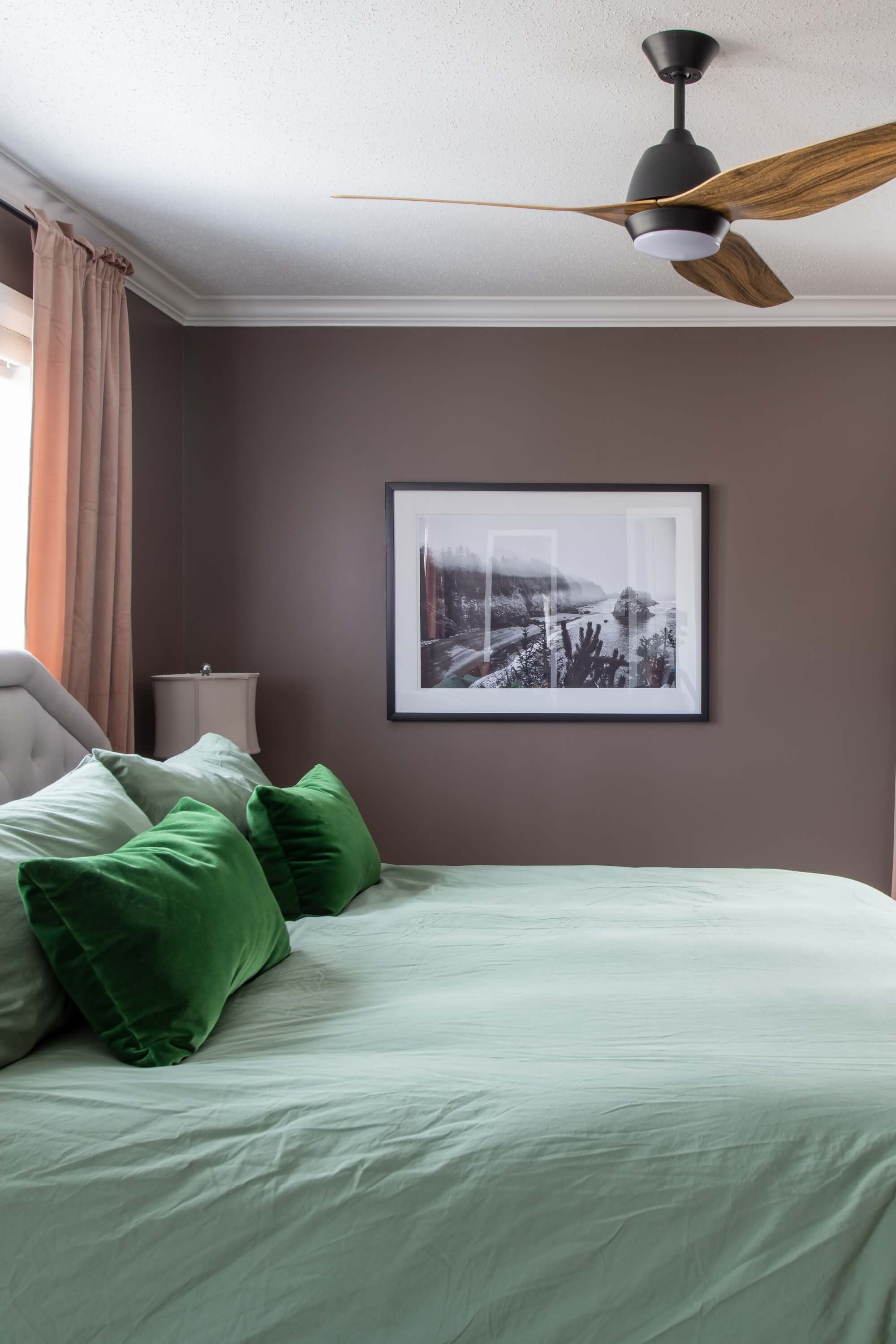 The renovation also introduced richer wall colour, updated lighting, modern window treatments, and warm furniture pieces that make the room feel more grounded and inviting. The new ceiling fan, layered textures, and carefully selected décor all work together to create a balanced bedroom design that feels both modern and comfortable. Natural light from the large windows helps soften the darker palette and keeps the space bright.