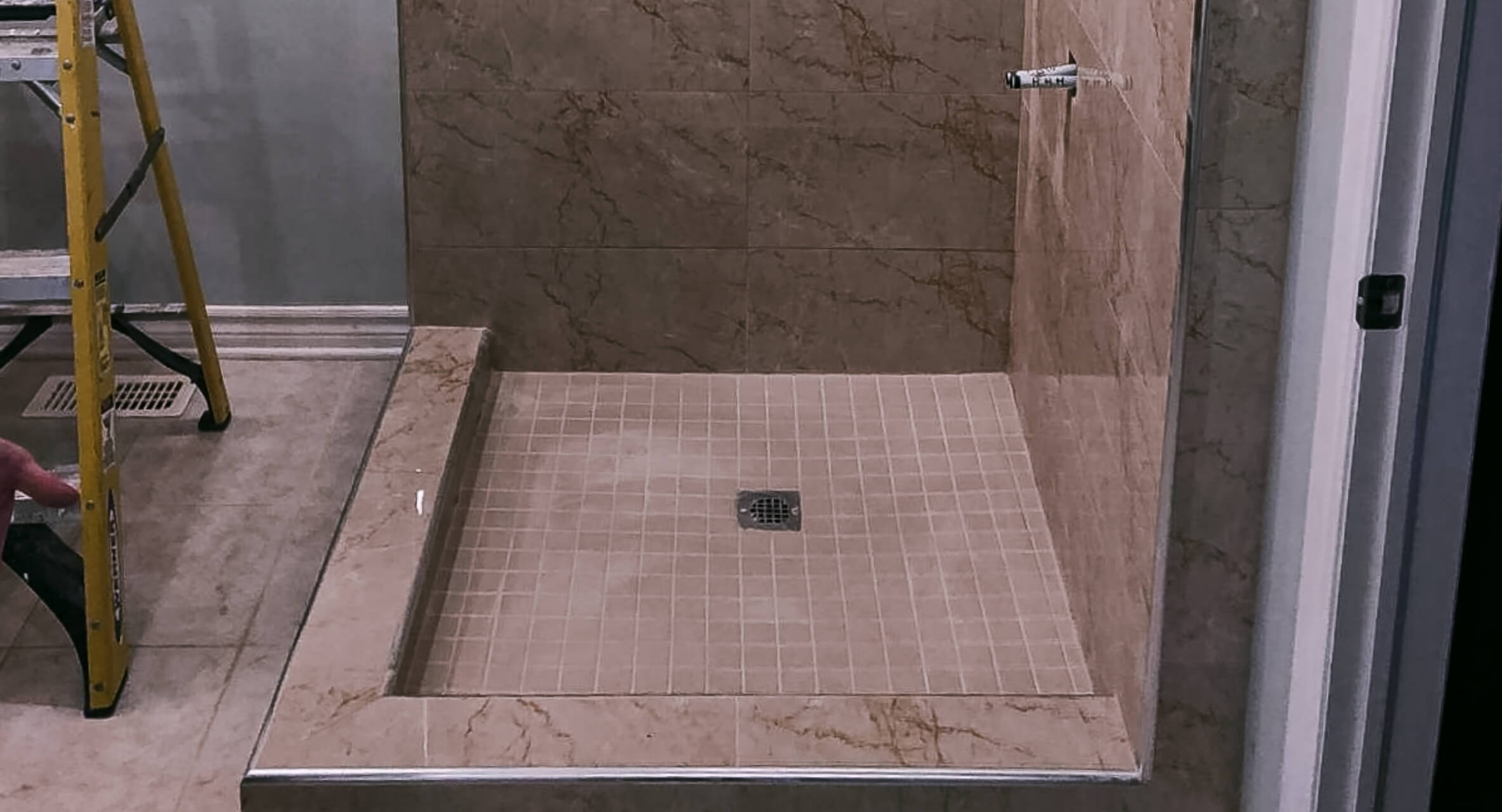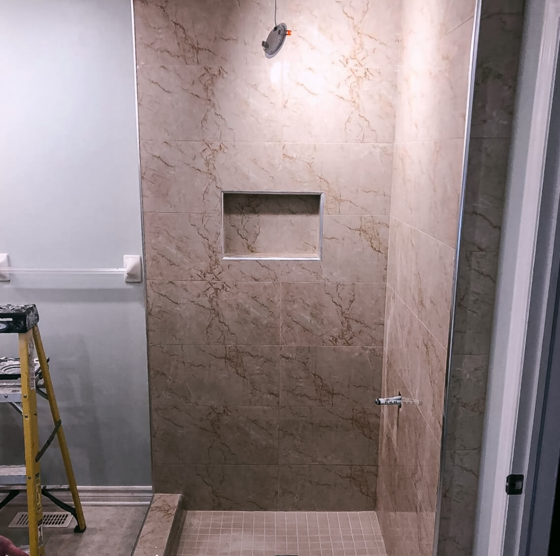 The renovation process involved rebuilding the shower area with proper wall preparation, waterproofing, tile installation, and careful detailing around the recessed niche and curb. From the in-progress stages to the finished install, every step focused on creating a durable ensuite shower built for long-term performance and everyday use.
