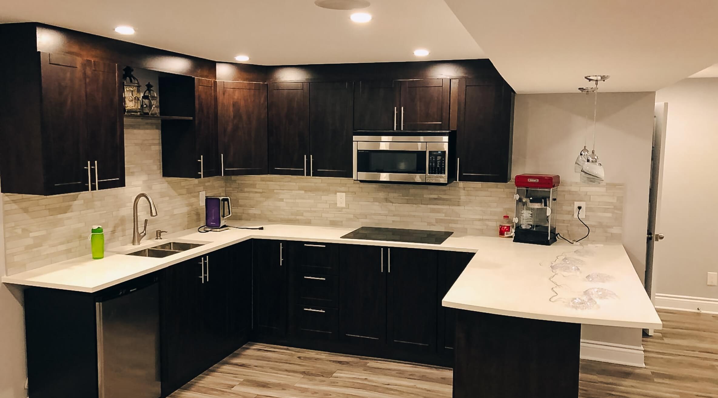 The design brings together dark cabinetry, bright countertops, warm-toned flooring, recessed lighting, and soft neutral walls for a clean and welcoming look. A built-in fireplace feature wall adds a strong focal point to the living area, while the basement kitchenette offers practical prep space, storage, and a modern finish that helps the suite feel complete and move-in ready.