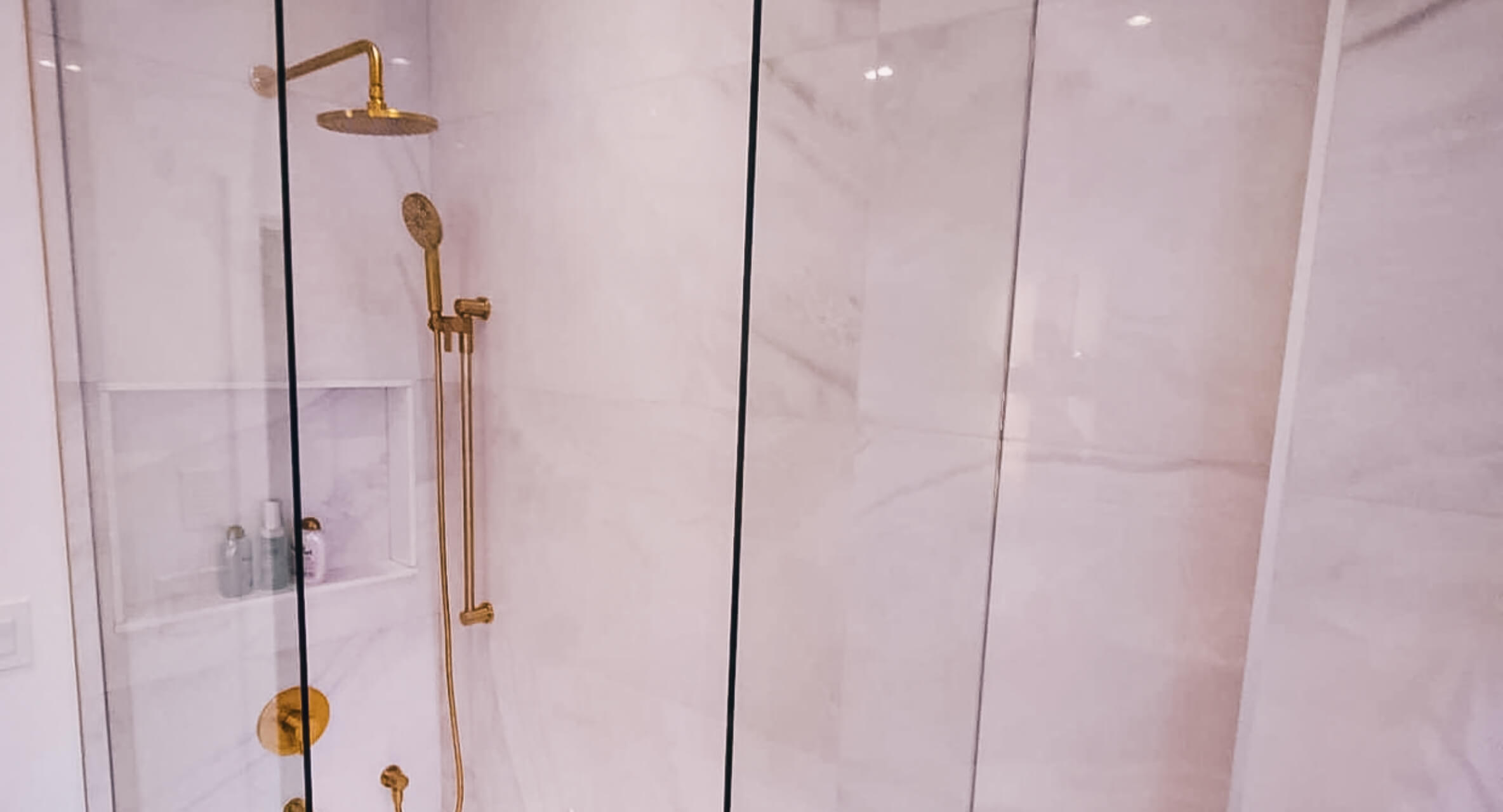 The bathroom renovation brought in a fresh spa-inspired feel with a fully tiled shower, frameless glass enclosure, built-in niche, and striking gold fixtures that add warmth and character to the space. Clean lines, soft tones, and updated finishes helped create a bathroom that feels elevated while still practical for daily use.