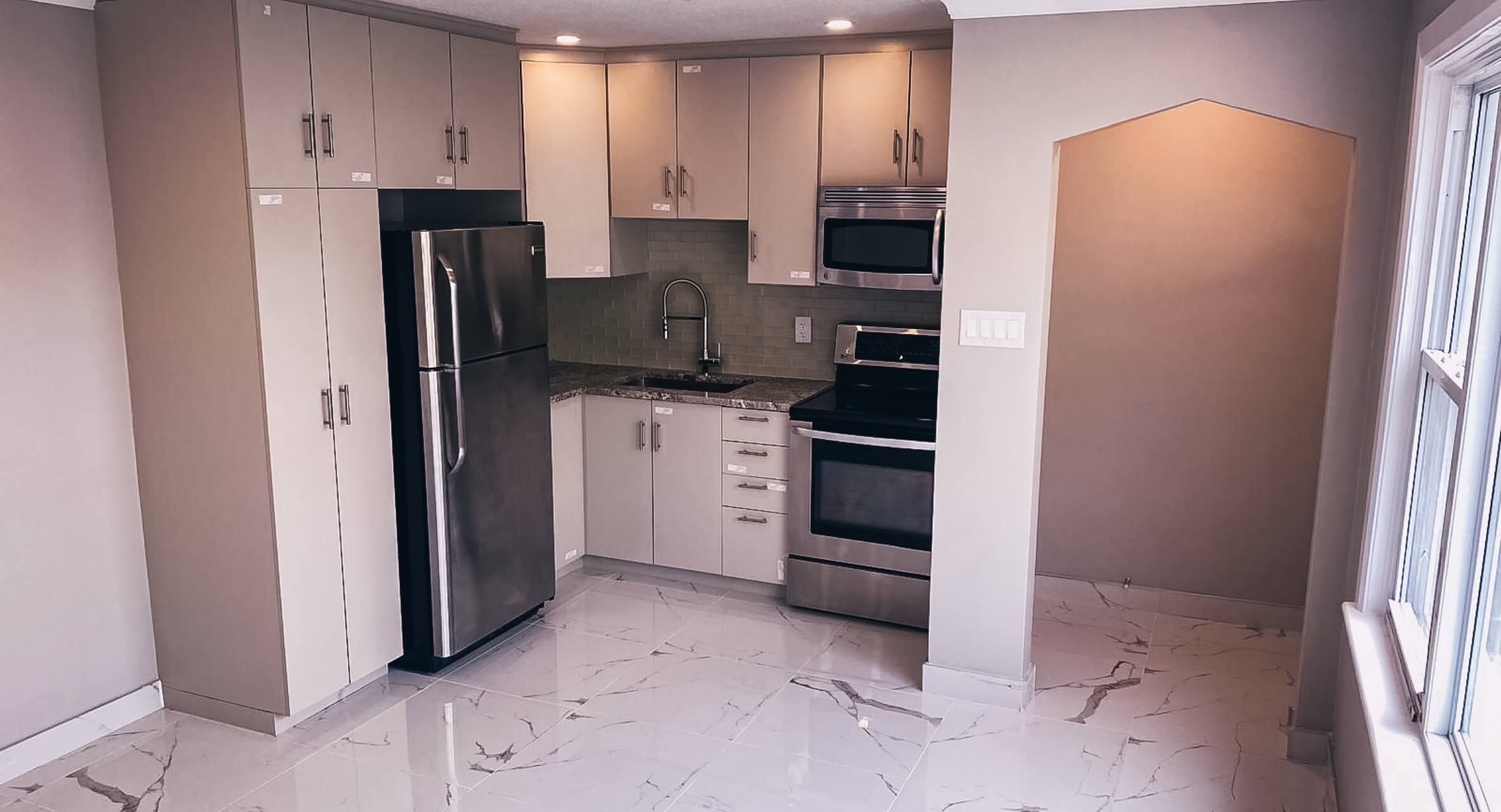 The kitchen was redesigned with new cabinetry, updated countertops, stainless steel appliances, and a sleek backsplash that helped maximize both storage and usability. The layout makes efficient use of the space while keeping the overall look simple and contemporary. Paired with the large-format marble-look tile flooring, the kitchen now feels brighter, cleaner, and much more refined.